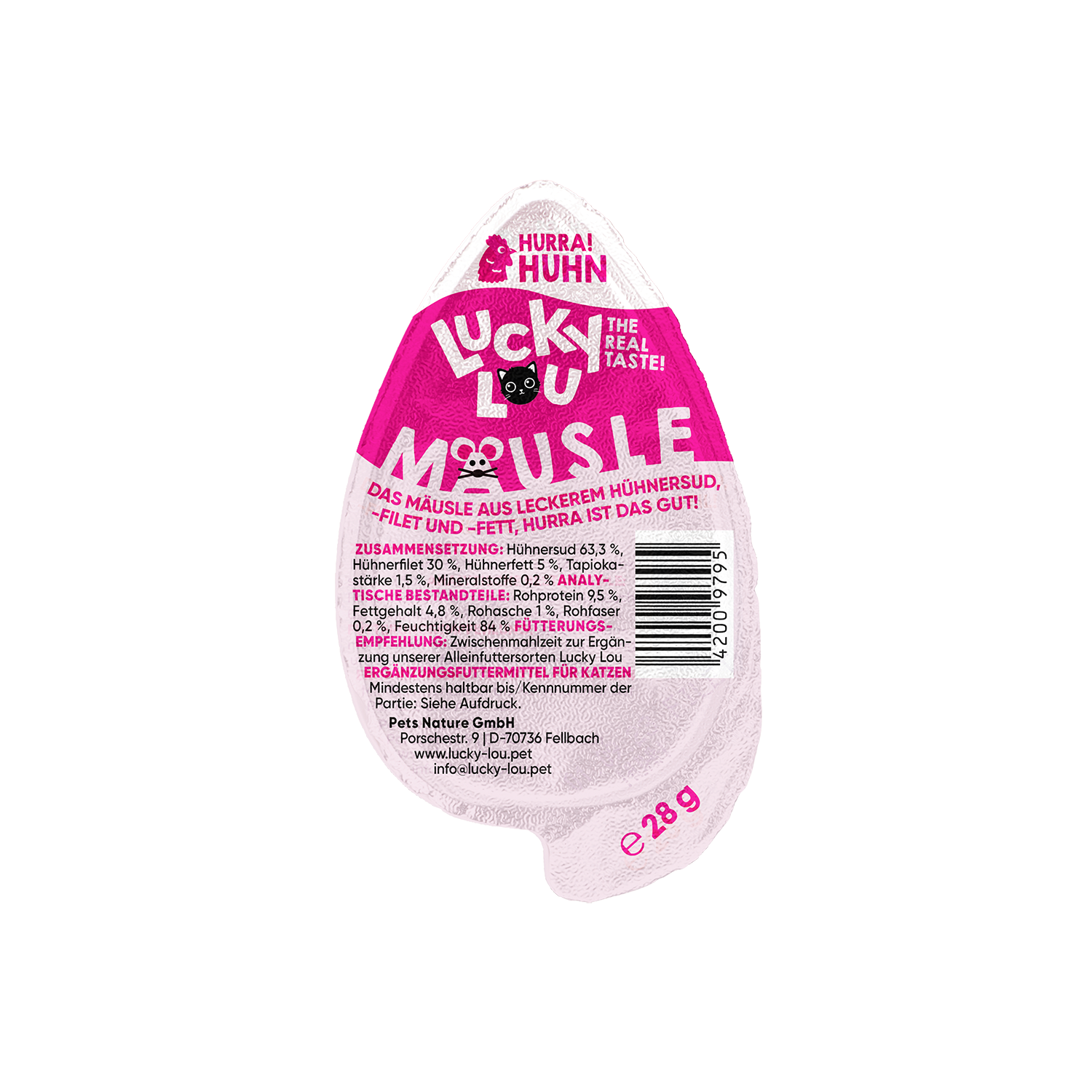 Hühnersud 63,3 %, Hühnerfilet 30 %, Hühnerfett 5 %, Tapiokastärke 1,5 %, Mineralstoffe 0,2 %