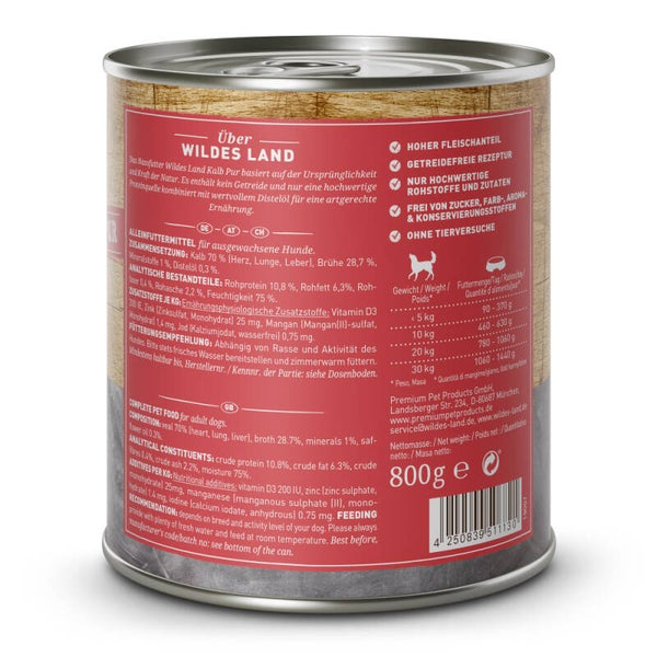 Das Wohlbefinden Ihres Hundes liegt uns von Wildes Land besonders am Herzen. Um Ihnen die artgerechte und natürliche Fütterung Ihres Lieblings zu ermöglichen, entwickeln wir unsere Produkte mit besonderer Sorgfalt, legen Wert auf Qualität und verwenden daher ausschließlich hochwertige und naturbelassene Zutaten. Das getreidefreie Nassfutter Kalb Pur der Linie Pur Adult mit 70% Fleisch und Innereien basiert auf der Ursprünglichkeit der Natur und versorgt Ihren Hund unter Verwendung nur einer tierischen Proteinquelle mit allen wichtigen Nährstoffen und Vitaminen. Die Zugabe von reinem Distelöl komplettiert die Komposition und macht sie nach neuesten wissenschaftlichen Erkenntnissen zu einem artgerechten und natürlichen Hundefutter, das optimal an die Bedürfnisse Ihres Haustiers angepasst und zudem besonders schmackhaft und verträglich ist. Das Menü Kalb Pur eignet sich für ausgewachsene Hunde aller Rassen.
