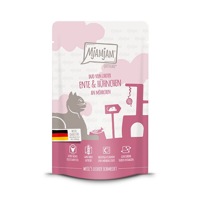 Zweimal mehr Geschmack, zweimal mehr „Food-Fun“, zweimal mehr MjAMjAM – egal ob „Paula“ oder „Bruno“, alle lieben MjAMjAM-DUO! Wer den vollen Geschmack gleich doppelt erleben möchte, sollte schnellstens zu unseren leckeren DUO-Sorten greifen. Zarte Ente & saftiges Huhn an Möhrchen verzaubern den Napf Deiner Samtpfote in ein Schlaraffenland. Und das mit einem extra hohen Fleischanteil und ganz ohne künstliche Zusätze. Klingt „pawtastisch“? Dann ab in den Warenkorb damit!