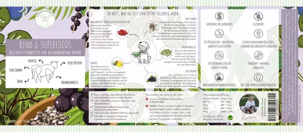 65 % bestehend aus Rinderherzen, Rindfleisch, Rinderlebern, Rinderlungen, Rinderpansen, 27,8 % BruÌhe, 3 % Acai-Beeren, 2 % Chia Samen, 1 % Brunnenkresse, 0,2 % Hanföl
