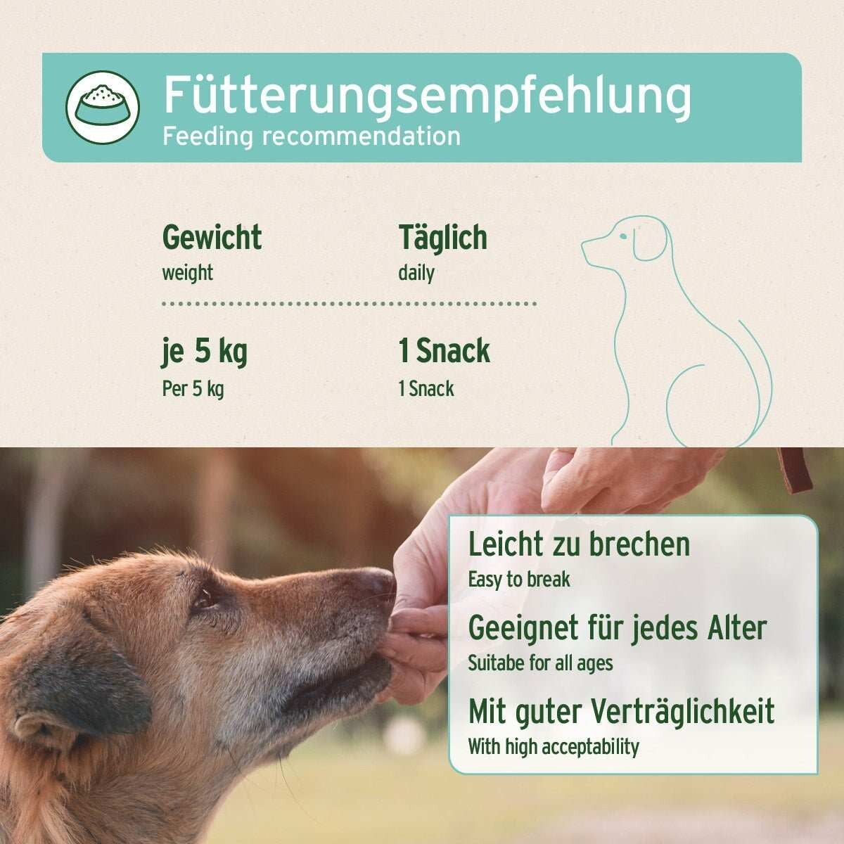 AniForte® Denta-Snacks werden besonders schonend hergestellt, damit alle Inhaltsstoffe erhalten bleiben. Dank der leichten Textur sind sie besonders handlich, passen in jede Jackentasche, krümeln und zerfallen nicht und lassen sich auch für kleine Hunde einfach mit der Hand teilen. Die weiche Konsistenz macht sie auch für Welpen und ältere Hunde zu einem perfekten Leckerli. Die Leckerlis können als Belohnung oder beim Training gegeben werden.