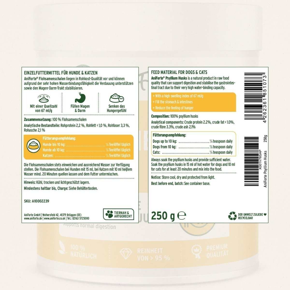 AniForte® Flohsamenschalen für Hunde und Katzen sind ein vollwertiges Einzelfuttermittel in Rohkost-Qualität. Die sehr hohe Quell- und Wasserbindungsfähigkeit der Flohsamenschalen kann die Verdauung der Vierbeiner aktiv unterstützen. Das hochwertige Naturprodukt ist als Unterstützung zur Ernährung, des Stoffwechsels und der Verdauung Deines Vierbeiners bestens geeignet.