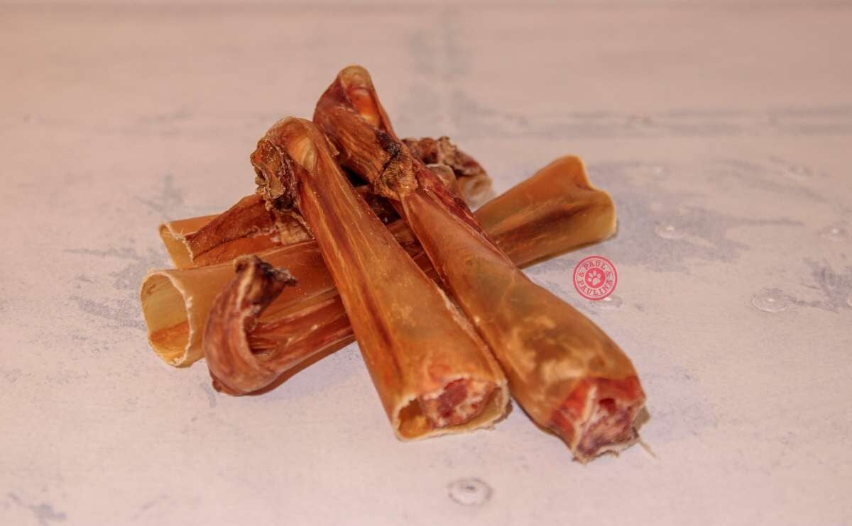 Beim Schneiden der Ochsenziemer bleiben immer wieder unterschiedlich große Abschnitte übrig, die innen hohl sind, aber dennoch natürlich immer noch ein Leckerbissen für jeden Hund sind.