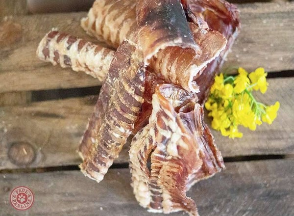 Die Luftröhren werden schlachtfrisch in ca. 12cm lange Streifen geschnitten und dann schonend getrocknet. Ein fettarmer Snack für zwischendurch, der nicht splittert.