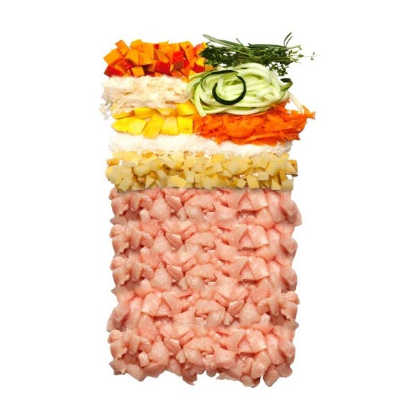 Frisches Muskelfleisch vom Huhn (64 %), Kartoffelflocken (12 %), Kokosmehl (4 %), Süßlupine, Aprikose* (1,5 %), Karotte* (1,4 %), Zucchini* (1,4 %), Sellerie* (1,1 %), frische Geflügelleber (1 %), Bierhefe* (1 %), Leinsaat (1 %), Apfel* (0,8 %), Kürbis* (0,7 %), Pastinake* (0,7 %), Eierschalenpulver (0,7 %), Rote Bete* (0,5 %), Mineralerde (0,5 %), Petersilienwurzel* (0,4 %), Bockshornklee (0,4 %), Rapskernmehl (0,4 %), Löwenzahn* (0,3 %), Hagebutte* (0,3 %), Kamille* (0,2 %), Aroniabeere* (0,2 %), Spinat* (0,2 %), Seealge (0,1 %), Rosmarin (0,1 %), Thymian (0,1 %), Mineralstoffe *getrocknet
