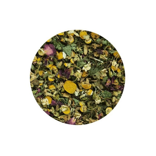Kamillenblüten, Schafgarbenblüten, Melissenblätter, Anis, Hamamelisblätter, Schwarzkümmel, Rosenblüten rot, Malvenblätter, Bachblüten-Essenz (Holly, Beech, Sweet Chestnut, White Chestnut, Centaury, Chicory, Honeysuckle)