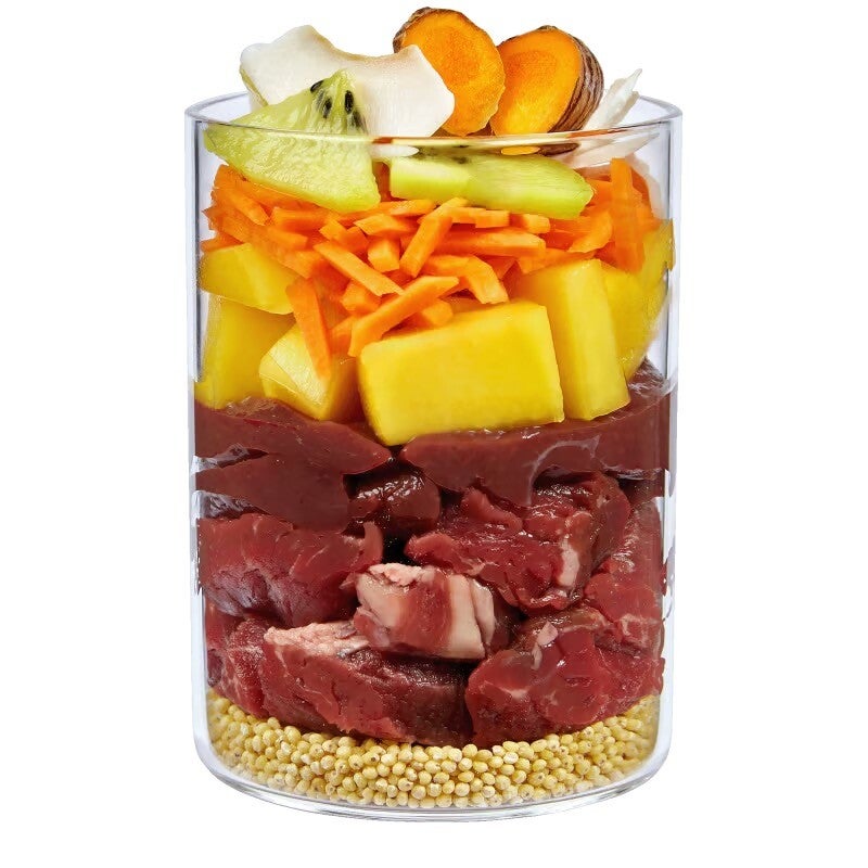 Rinderherz (35 %), Karotte, Zucchini, Rinderlunge (11 %), Rinderleber (8 %), Hirse (5 %), Süßkartoffel, Apfel (5 %), Mango (2 %), Pfirsich (2 %), Kiwi (2 %), Melone (2 %),Kokosmehl (1 %), Rapsöl, Bierhefe*, Austernschale*, Sonnenblumenkerne (0,3 %),Lavendel*, Majoran*, Thymian*, Melissenkraut*, Portulakkraut*, Kurkuma* (0,1 %), Spirulina*, Mineralerde*, Seealge*, Mineralstoffe *getrocknet