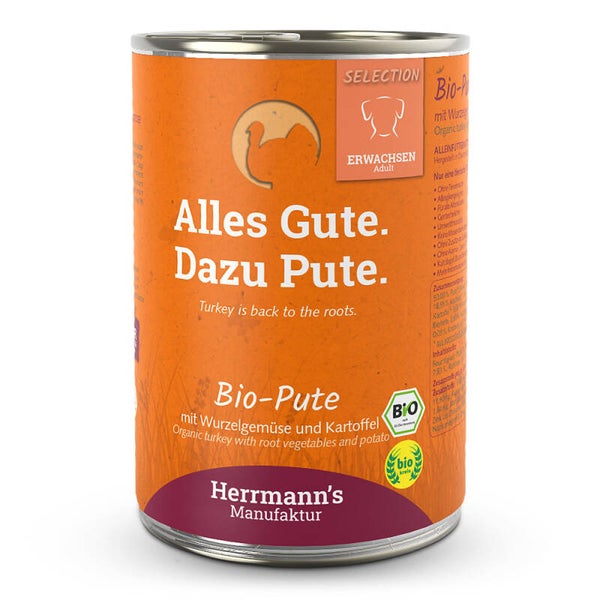 Herrmann's Selection Adult Bio-Pute mit Wurzelgemüse und Kartoffel oder "Alles Gute. Dazu Pute."