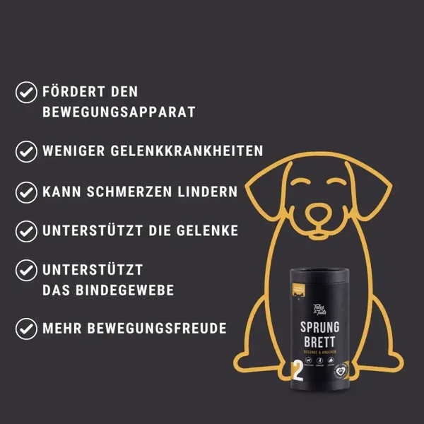 Hier wird dein Hund schon beim Anblick munter um dich herumtanzen: Saftiges Lamm als Monoprotein trifft auf natürliche Geschenke für Gelenke wie Kollagen, Grünlippmuschel und Bierhefe zur gesunden Unterstützung des Bewegungsapparates für wilde Jungspunde bis rüstige Hunde-Rentner. Mit den Sprungbrett-Snacks kannst du deinen Vierbeiner auf leckere Art belohnen und gleichzeitig für starke Gelenke und Knorpel sorgen - da springt jeder Hund drauf an!