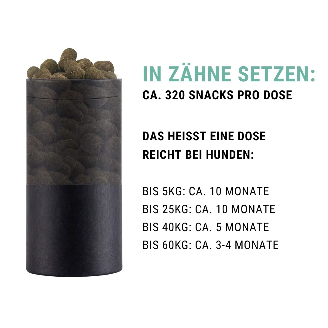Hier strahlt dein Hund schon beim Anblick über's ganze Gesicht: Diese Snacks zur Unterstützung der Maulhygienesind alles andere als NullachtfuffZahn! Damit das nächste Küsschen deines Hundes dir nicht stinkt, sorgen hochwertige, natürliche Inhaltsstoffe vereint mit köstlichem Lamm als Monoprotein dafür, dass er auch wirklich noch ganz frisch im Maul ist. Die besondere Kombination aus Seealge, Wasserminze und Pfefferminze kann bereits bestehenden Zahnstein lösen und Neubildung verhindern, Mundgeruch vorbeugen und die Gesundheit von Zähnen und Zahnfleisch erhalten.