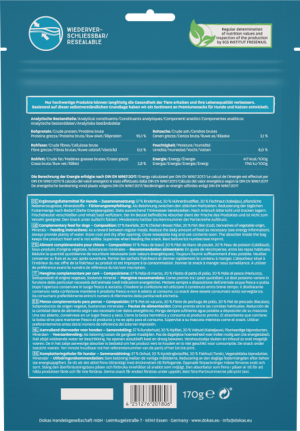 57 % Rinderhaut, 20 % Hühnerbrustfilet, 20 % Fischhaut (Kabeljau), pflanzliche Nebenerzeugnisse, Mineralstoffe