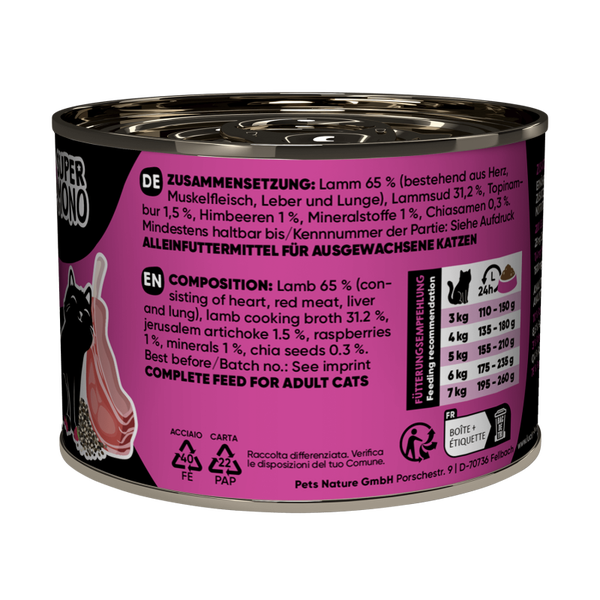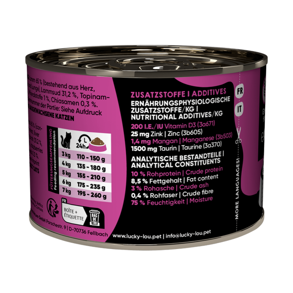 Lamm 65 % (bestehend aus Herz, Muskelfleisch, Leber und Lunge), Lammsud 31,2 %, Topinambur 1,5 %, Himbeeren 1 %, Mineralstoffe 1 %, Chiasamen 0,3 %