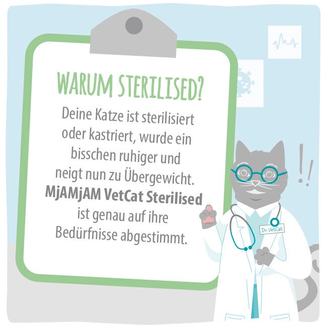 Dr. VetCat empfiehlt: MjAMjAM VetCat Sterilized! Diese Mahlzeit kann nicht nur die Gewichtsregulierung deines Lieblings unterstützen, sondern bietet deiner Katze gleichzeitig das gewohnte Geschmackserlebnis von MjAMjAM. Auch wenn’s nicht mehr klappt, klappt’s zumindest im Napf!