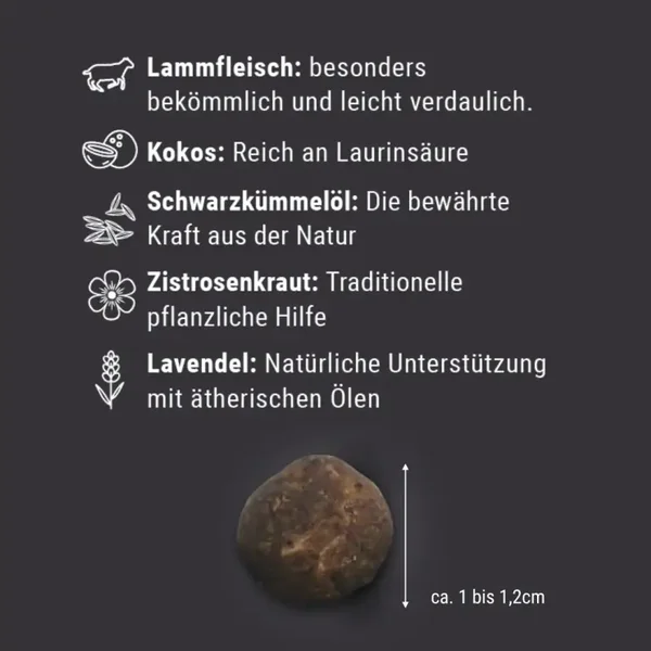 Lamm 80%, Kokosraspel 6%, Schwarzkümmelöl 4%(Nigella Sativa (lat. für echter Schwarzkümmel)), Zistrosenkraut 3%, Kokosöl 2,5%, Flohsamen 2,5%, Lavendel 1%, Hefeextrakt 1%.