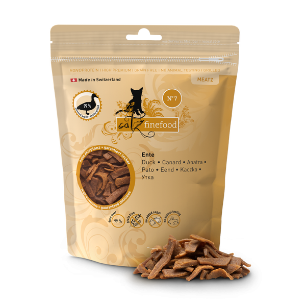 Mit unseren beliebten catz finefood Meatz® gönnst du deiner Katze einen ganz besonderen Leckerbissen. Die gegrillten und anschließend luftgetrockneten Leckerli mit dem sehr hohen Fleischanteil sind unwiderstehlich für die Vierbeiner und bieten ihnen eine perfekte Ergänzung zu unserem Nassfutter.